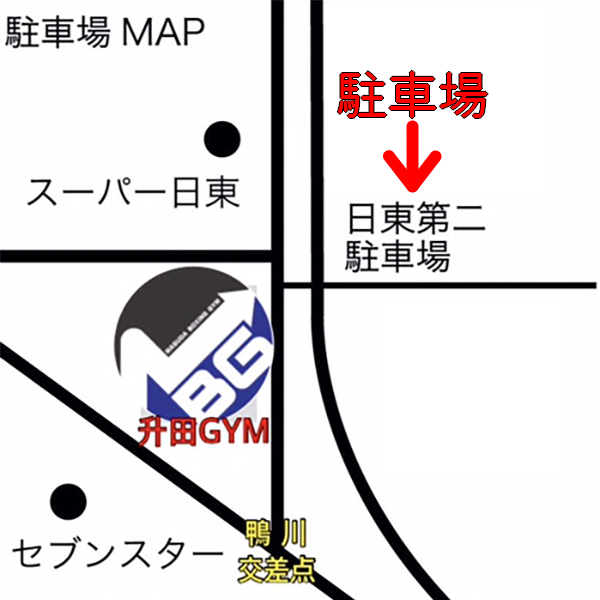 アクセス 升田ボクシングジム 〒791-8004 愛媛県松山市鴨川1丁目1-3 2F TEL:089-995-8502 駐車場 「スーパー日東鴨川店」第二駐車場 NO13~NO27(15台) ※当ジム下の駐車場は使用できません。